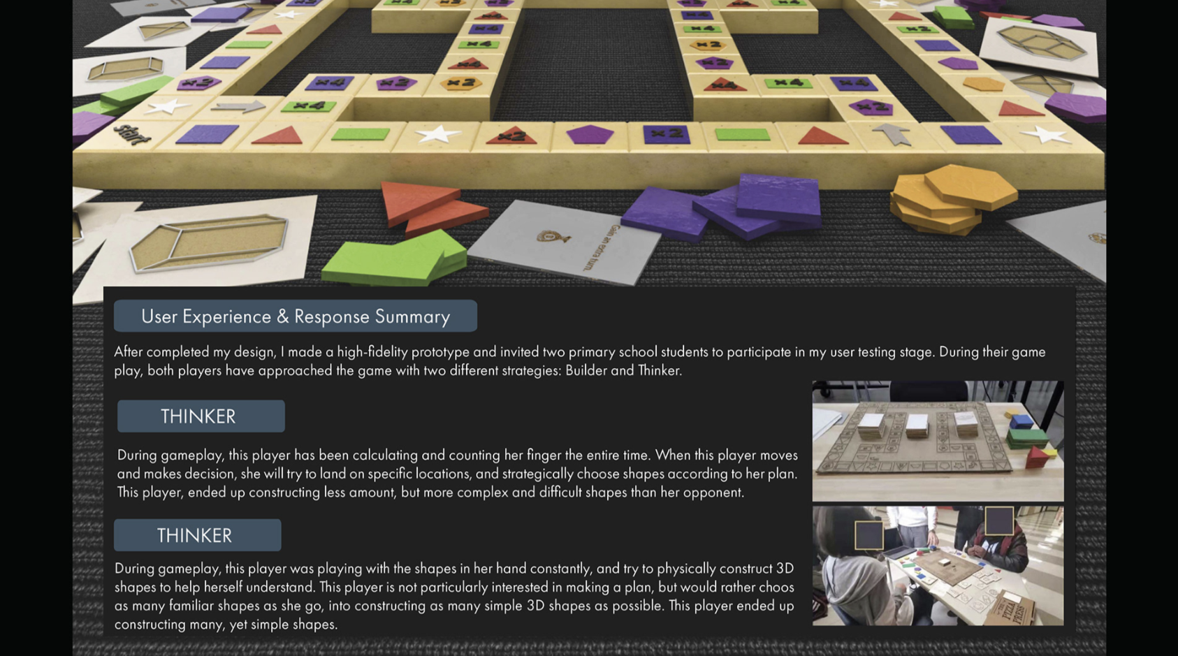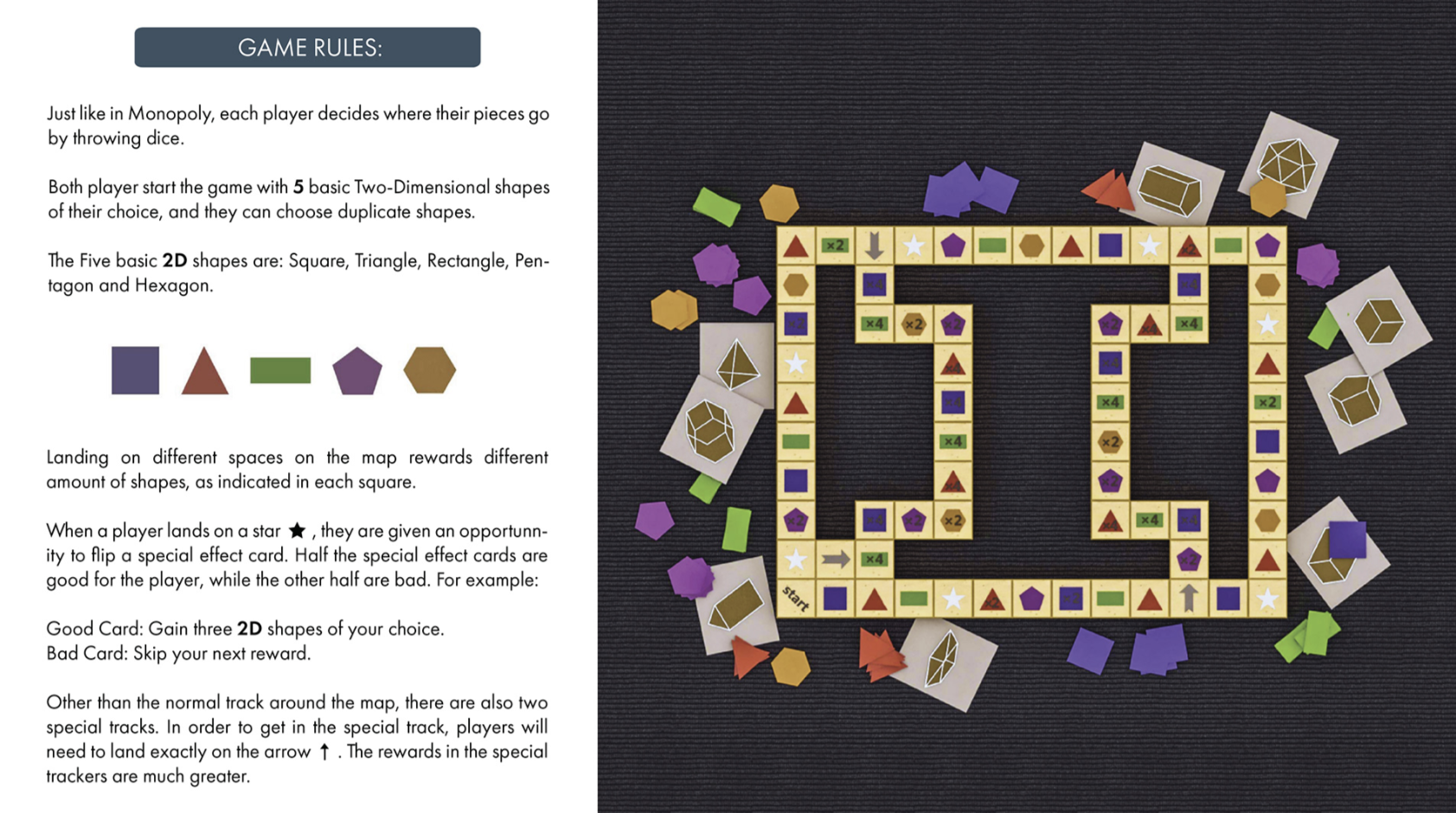 Shapeshifter is a board game that’s designed for school-age children to develop spatial reasoning skills and enhance their understanding of geometry. By engaging with 2D and 3D shapes, players are encouraged to think critically and strategically as they build higher-dimensional structures to earn points and win the game. The goal is to spark interests in subjects like math, design and shape construction in a fun, and interactive way. Additionally, this project serves as an experiment to observe player’s natural responses and interactions with the game’s design.