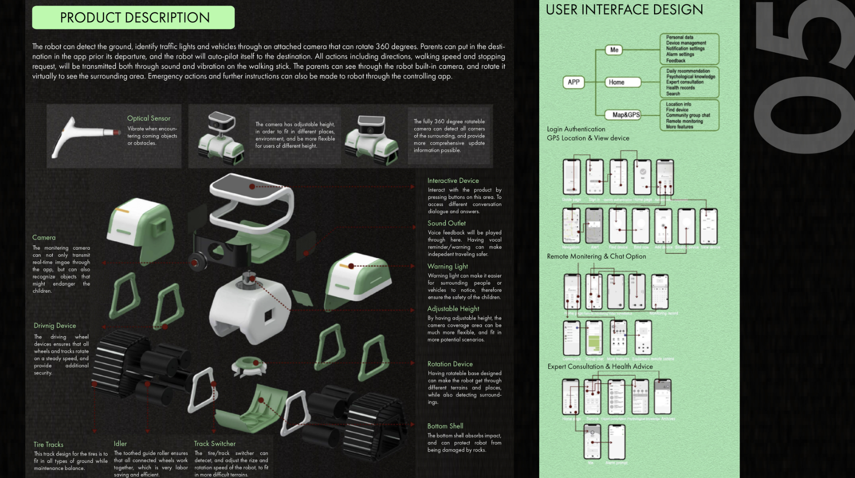 For visually impaired children, the world is full of unseen possibilities, yet their freedom to explore is often constrained by safety concerns. This concept envisions an intelligent mobility aid that not only guides them safely but also provides parents and caregivers with real-time monitoring. Blending independence with security, it transforms everyday walks into a journey of confidence and discovery.